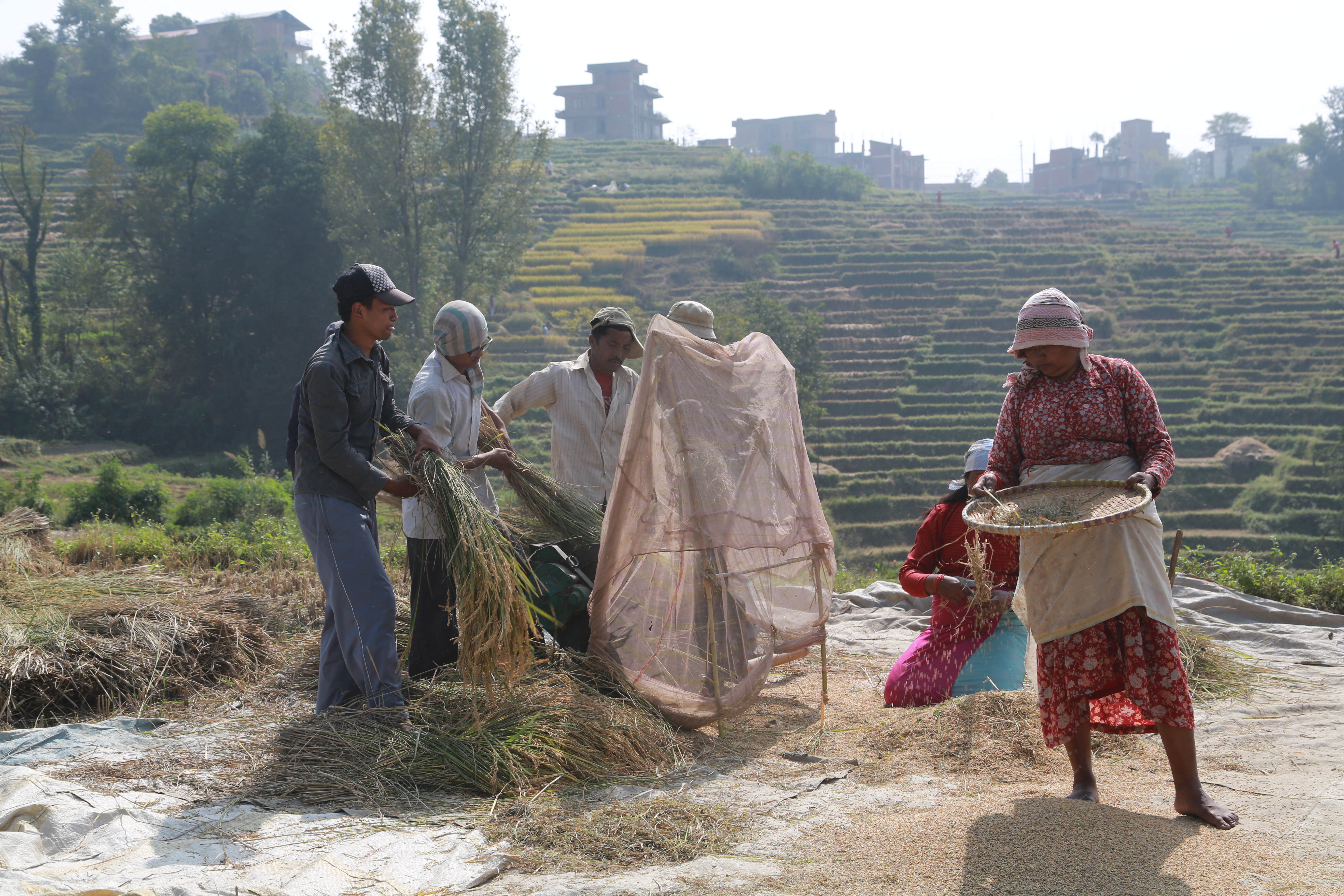 I scramble down the hill, early enough that the mist swallows me before I hit the valley. This is my little corner of heaven, free of crowds, free of exhaust fumes and traffic jams, and almost free of the city’s ubiquitous garbage. There are no stray dogs, which my Rhodesian Ridgeback, Biko, appreciates, as he can run off lead and enjoy his encounters with goats at his own speed. This is the Kathmandu of yore. Men use wooden plows and oxen to till the land. Some use hand hoes to break the hard clay soil into big grey chunks. The rice is threshed by a treadle-driven thresher or by whacking bound sheaths on the ground.