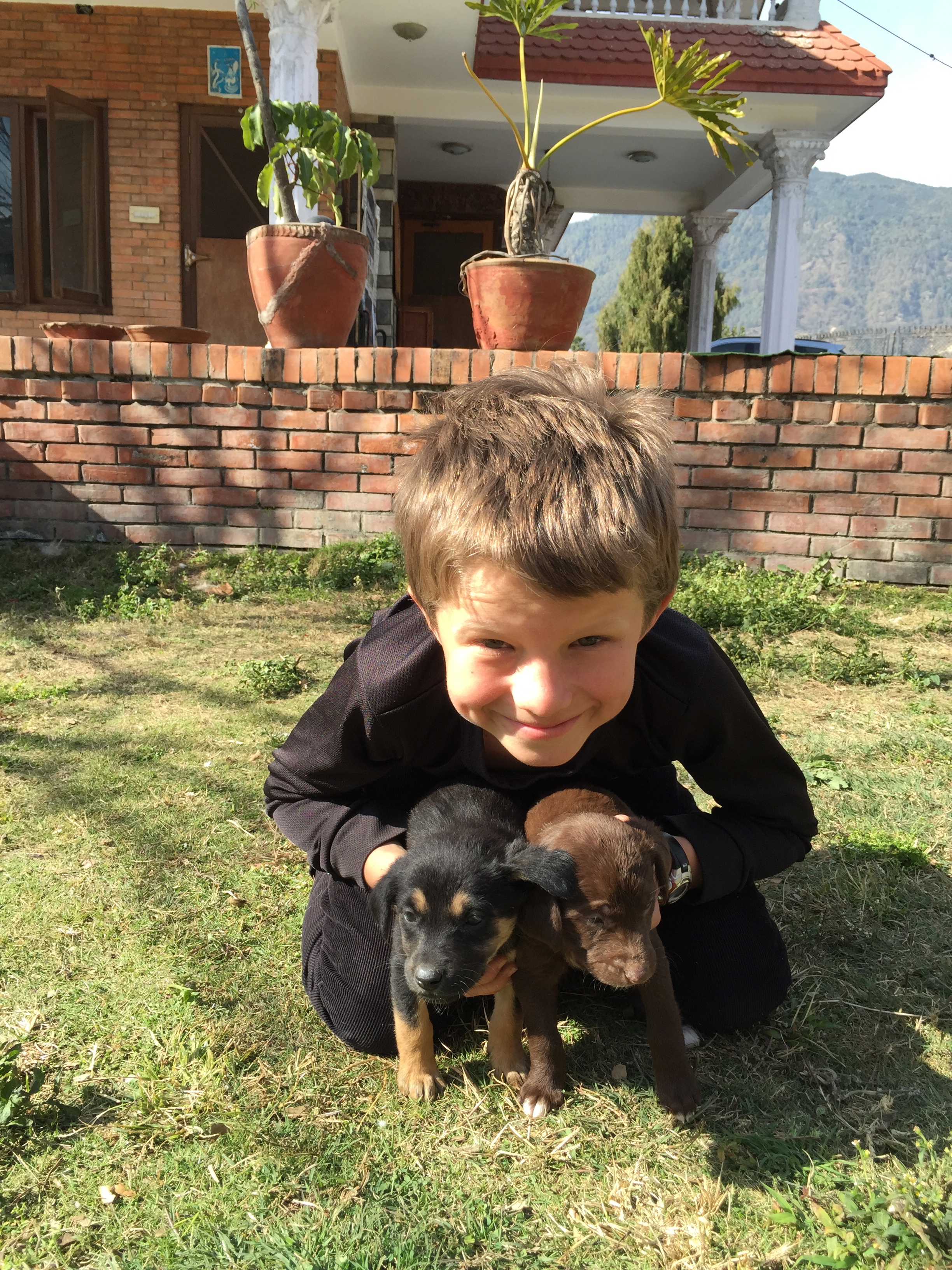 Lucas with two of Kali’s nine puppies, stray dogs we rescued on our street. Now at the Kathmandu Animal Treatment Centre. ©Donatella Lorch