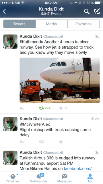 There was no government communication system in place to keep passengers informed but there some very dedicated Nepali journalists on Twitter. It was possible to follow the drama 24/7 in 140 characters or less. The disabled plane blocked the airport’s only runway, and every failed attempt to move it (there were many), every inch of molasses-slow towing, was documented in detail. The Nepali Times rechristened Tribhuvan International Airport as Tribhuvan Intermittent Airport.