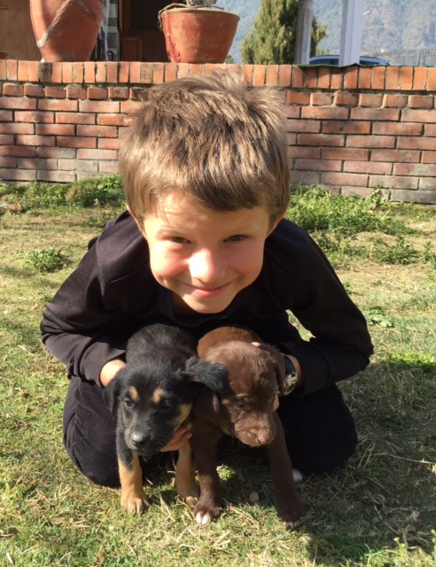 My son, Lucas, with two of Kali’s nine puppies. ©Donatella Lorch