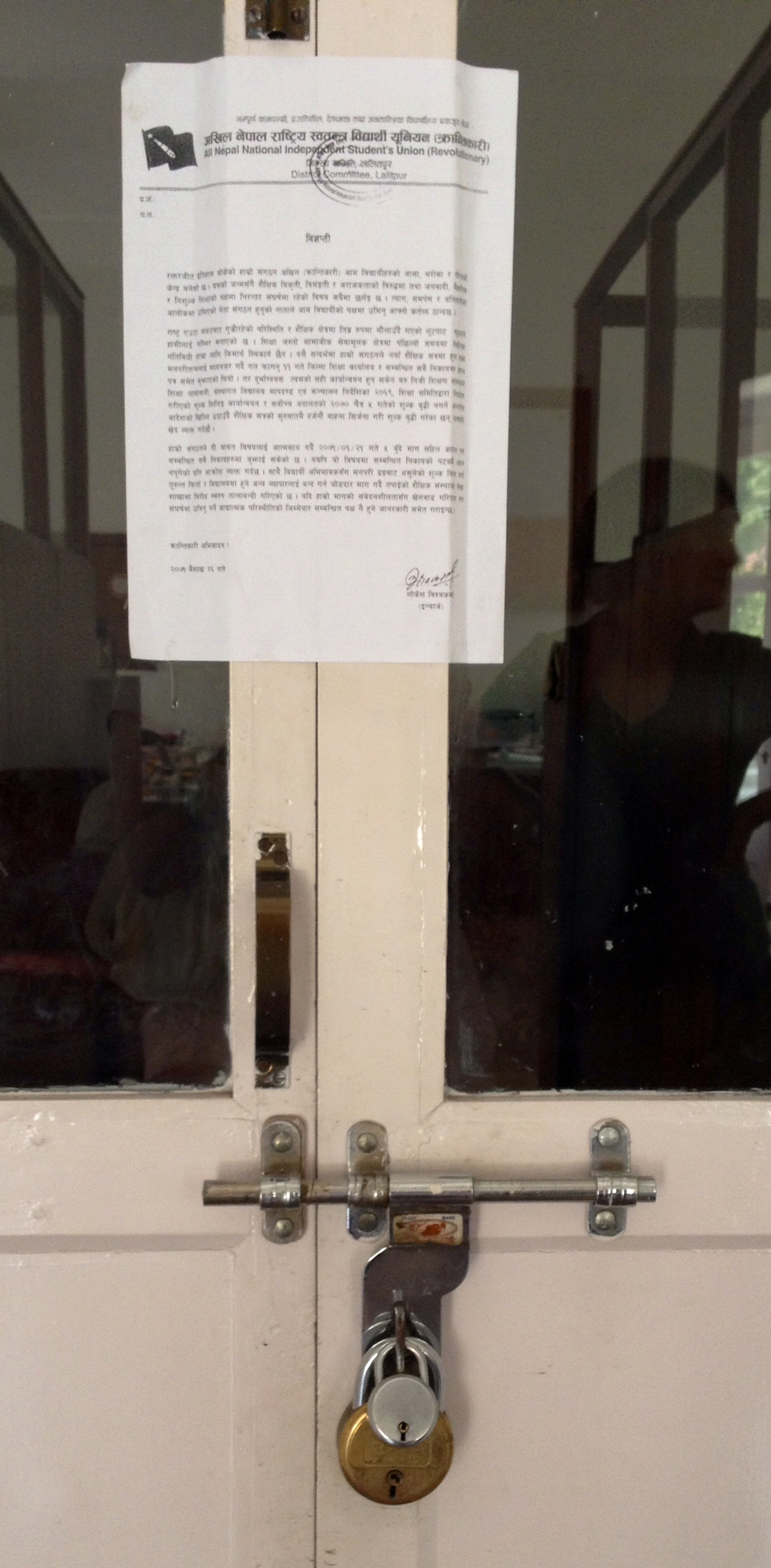 Padlocking as a threat is often used in Nepal, especially by communist youth groups. This year when private schools announced a tuition hike, the youth groups padlocked and sealed the offices of the schools’ accountants, and added threats of violence for good measure. It was fairly effective–because they have a reputation of delivering violence, fire bombing buses and taxis and (just this week) trashing local newspaper offices.