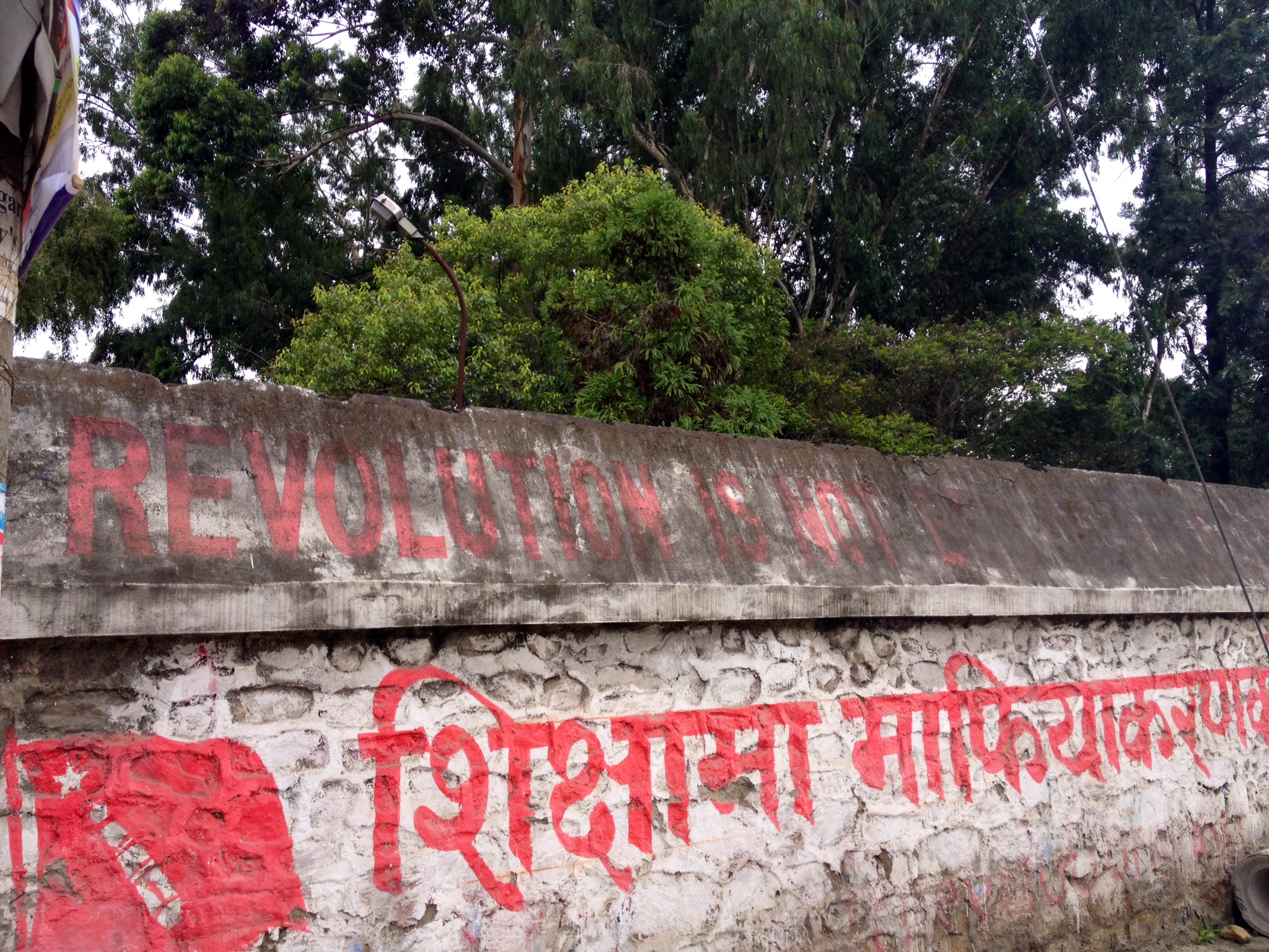 There is a fast-fading moldy quotation painted in two-foot high bold lettering on the concrete wall that border the main avenue of Patan, Kathmandu’s sister city. “REVOLUTION IS NOT BED OF ROSES, it declares in what was once blood-red paint, before the rest of the sentence fades into black-leaching monsoon mold. The author’s originally spelled name resurfaces briefly: “Friedl Castro.”