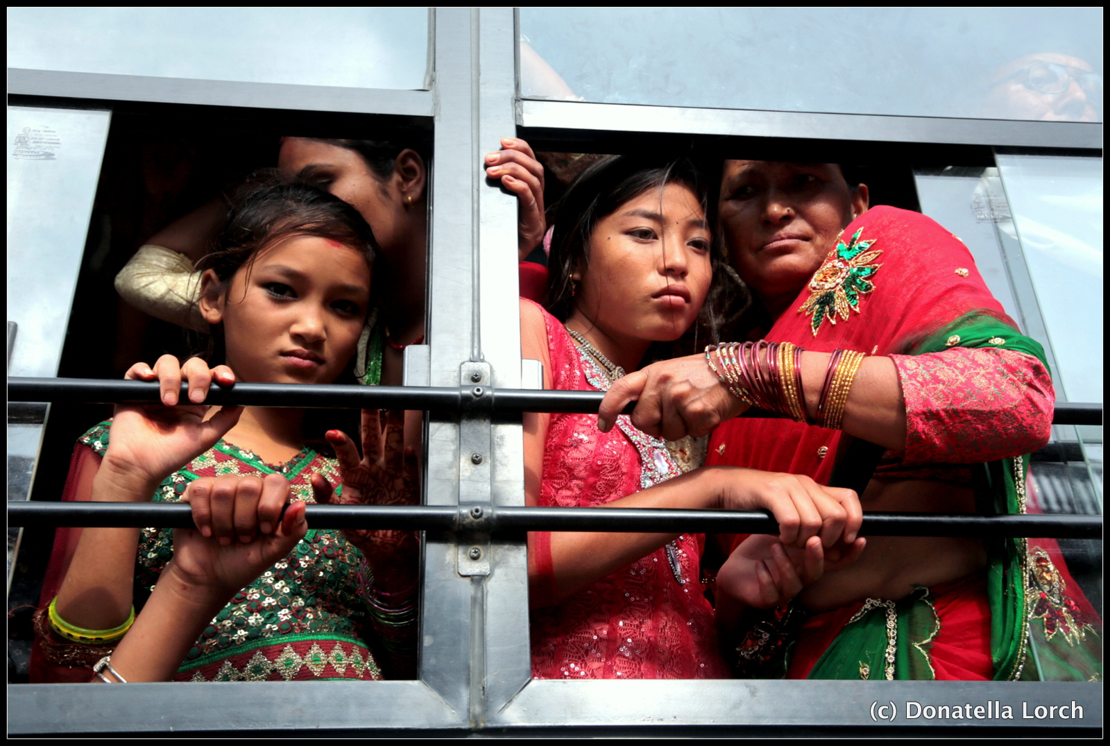 Women in traditional “wedding day” saris are scrunched on buses returning from worshipping at Pashupatinath, one of the world’s holiest Shiva shrines. ©Donatella Lorch