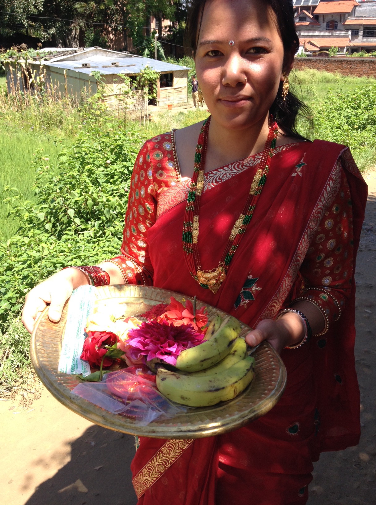 If a woman is very traditional, she will fast and she will also bathe her husband’s legs and drink the run-off water. This has some of my women friends in the States decrying marital abuse. But watching these red saris dancing in front of temples, standing and chattering on endless lines with their girlfriends and daughters, puja (offerings) and smart phones in hand, all bedecked in traditional gold jewelry, it is clear that, for them, Teej is not only about bonding but also about a great escape from endless daily chores and demanding husbands. It’s a time of year when gold prices in Kathmandu skyrocket. I’m inclined to believe that if you acquire new jewelry and a new sari, and spend five days with your friends, worshipping a husband is a fair exchange.
